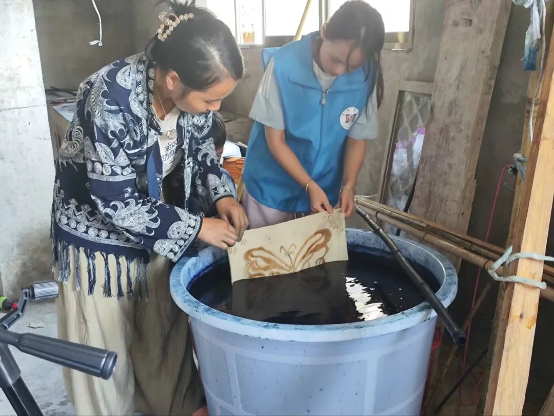 团队成员们在摆贝苗寨蜡染馆体验非遗蜡染,并在蜡染展厅相关负责人的指导下亲手制作了一幅非遗蜡染作品,团队成员们在制作过程中深刻感受到了苗族非遗蜡染文化,切实感受到了非遗蜡染的多样化与多元化。