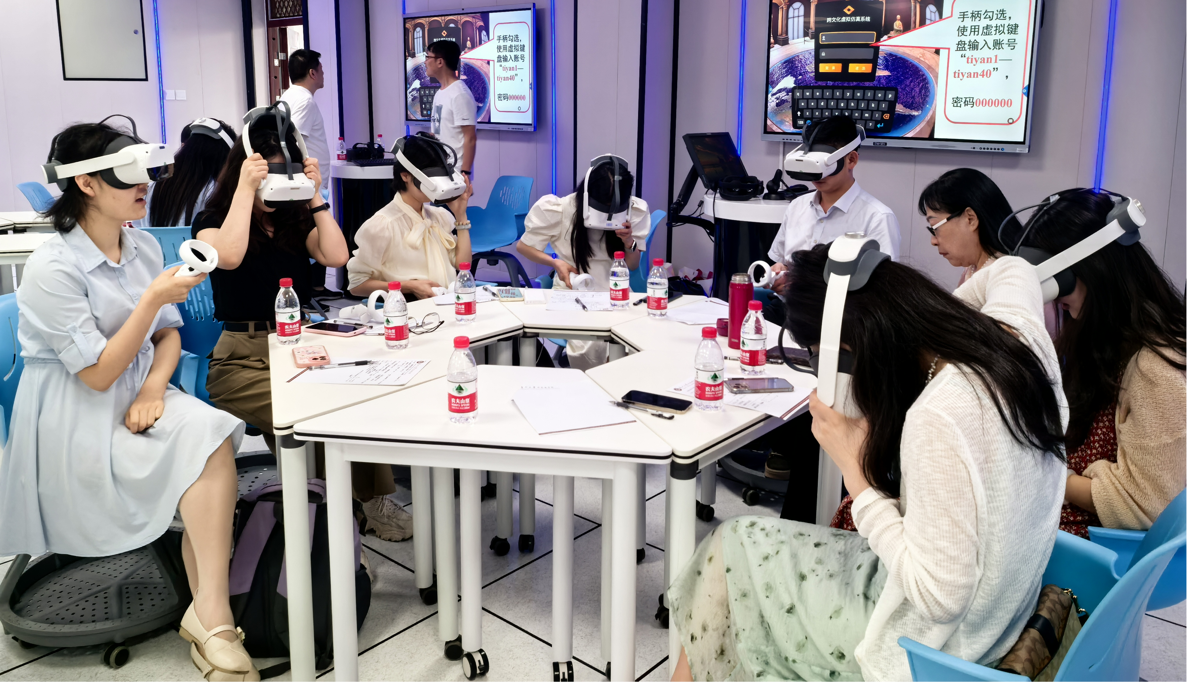 会后,外国语学院沈麟博士与基础部教师在语言虚拟仿真实验室分享了学生跨文化交际能力培养虚拟课堂。
