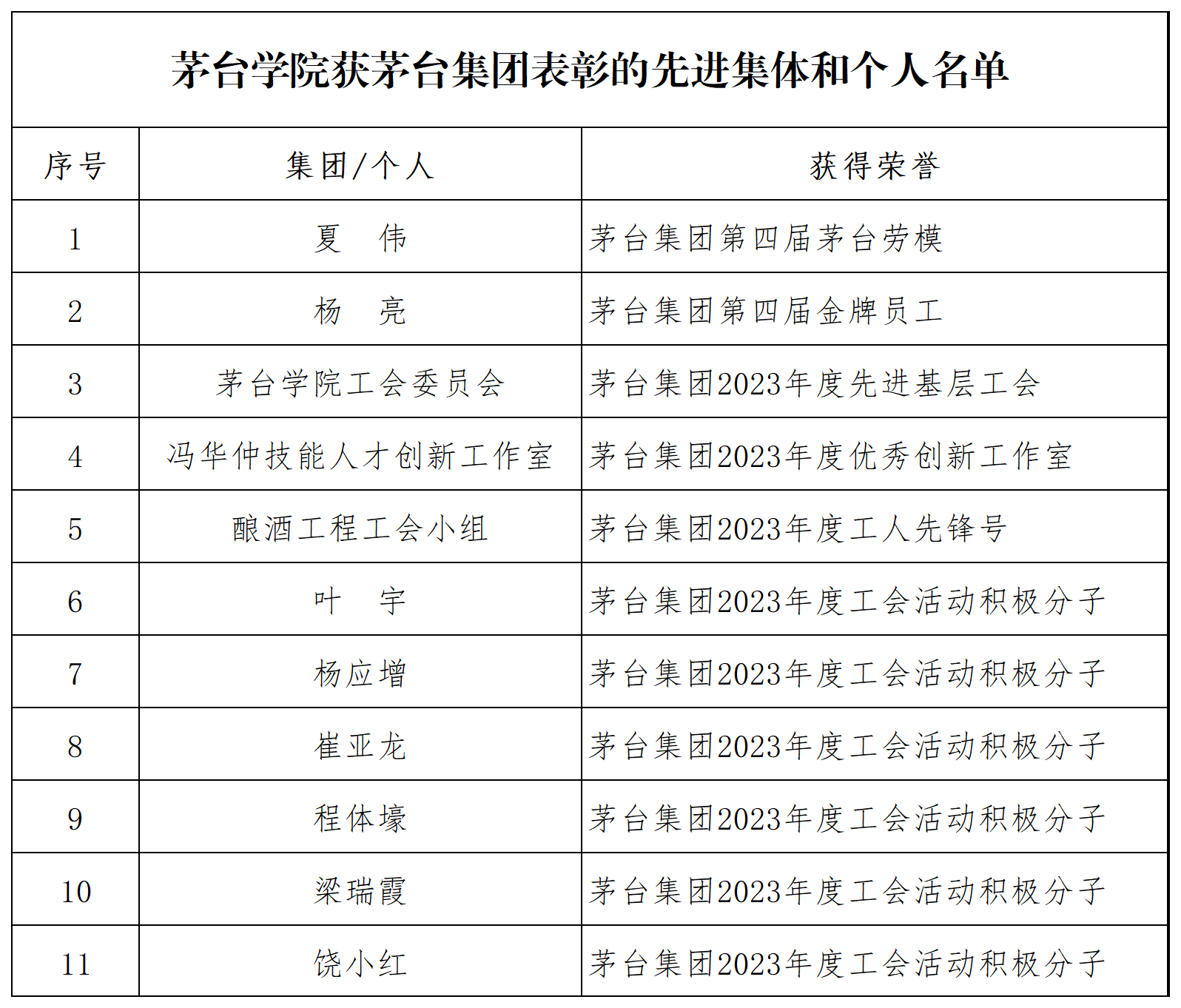 5月10日,根据茅台集团相关表彰决定的文件,437必赢会员中心资源环境系教师夏伟获茅台集团第四届茅台劳模,酿酒工程系教师杨亮获茅台集团第四届金牌员工,437必赢会员中心工会委员会获茅台集团2023年度先进基层工会,冯华仲技能人才创新工作室获茅台集团2023年度优秀创新工作室,酿酒工程工会小组获茅台集团2023年度工人先锋号,多人获茅台集团2023年度工会活动积极分子。