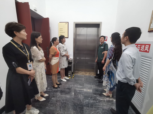 学习研讨结束后党支部同志、图书信息中心勤工俭学和网络维护的同学们一起来到图书馆二楼及广场前进行电梯安全使用规范学习及灭火器使用演练。