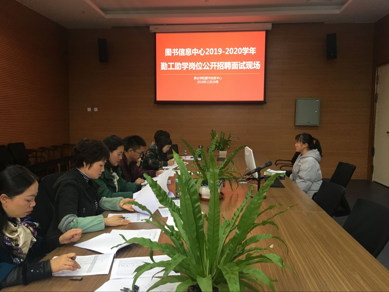 经过几天的策划准备,图书信息中心勤工助学岗位招聘面试于11月26日在图书馆二楼会议室顺利开展。此次招聘工作由图书信息中心石丁兰老师牵头策划,以公开、公平、公正、自愿报名的模式开展招聘工作。